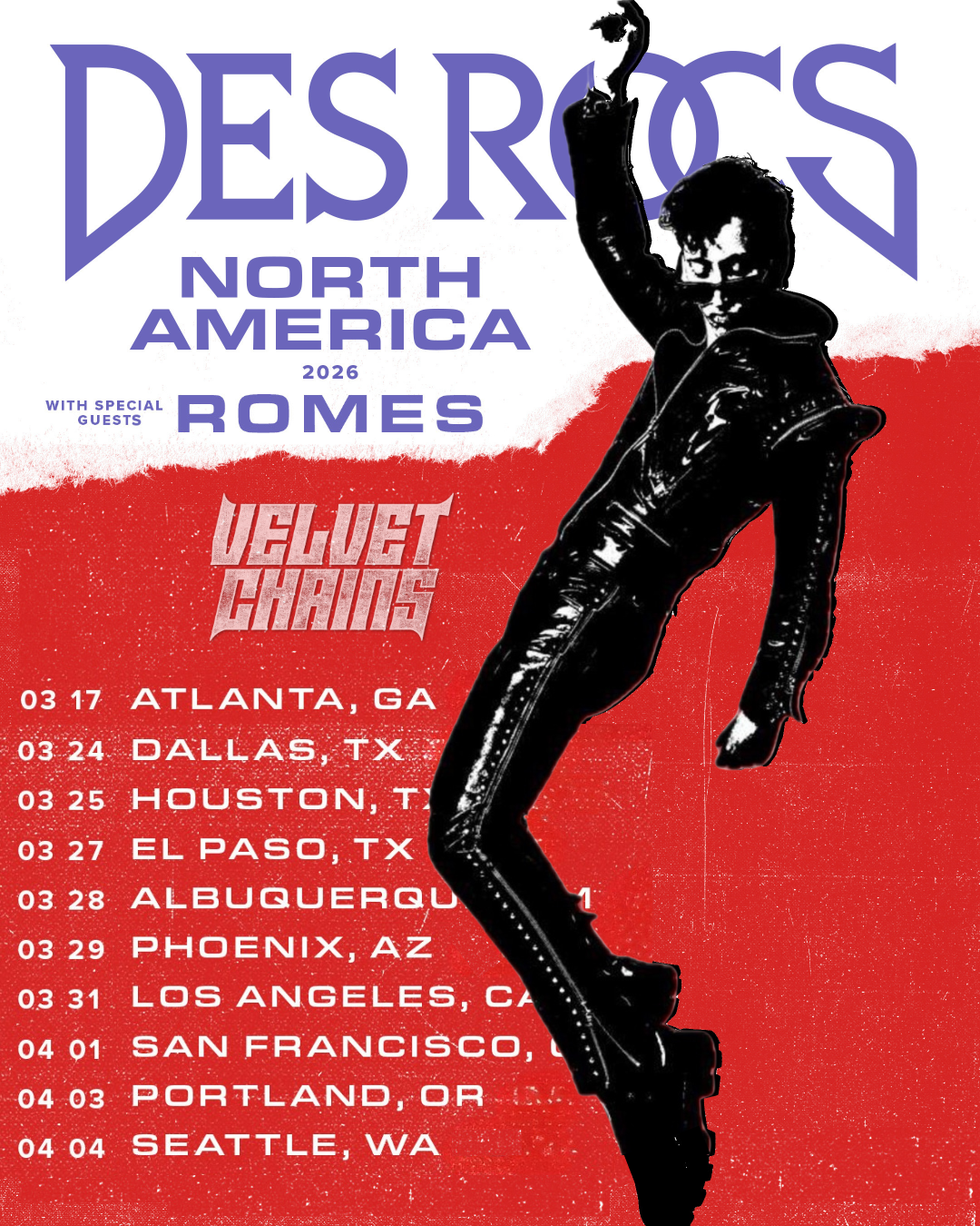 Velvet Chains is also preparing to release a music video for “Hurt Me,” set to arrive in early March. Shortly after, they’ll hit the road for the DES ROCS North America Tour 2026 alongside RØMES, bringing their high-energy live show to major markets across the U.S. The run kicks off in March and continues through early April, with stops in Atlanta, Dallas, Houston, Phoenix, Los Angeles, San Francisco, Portland, Seattle, and more.